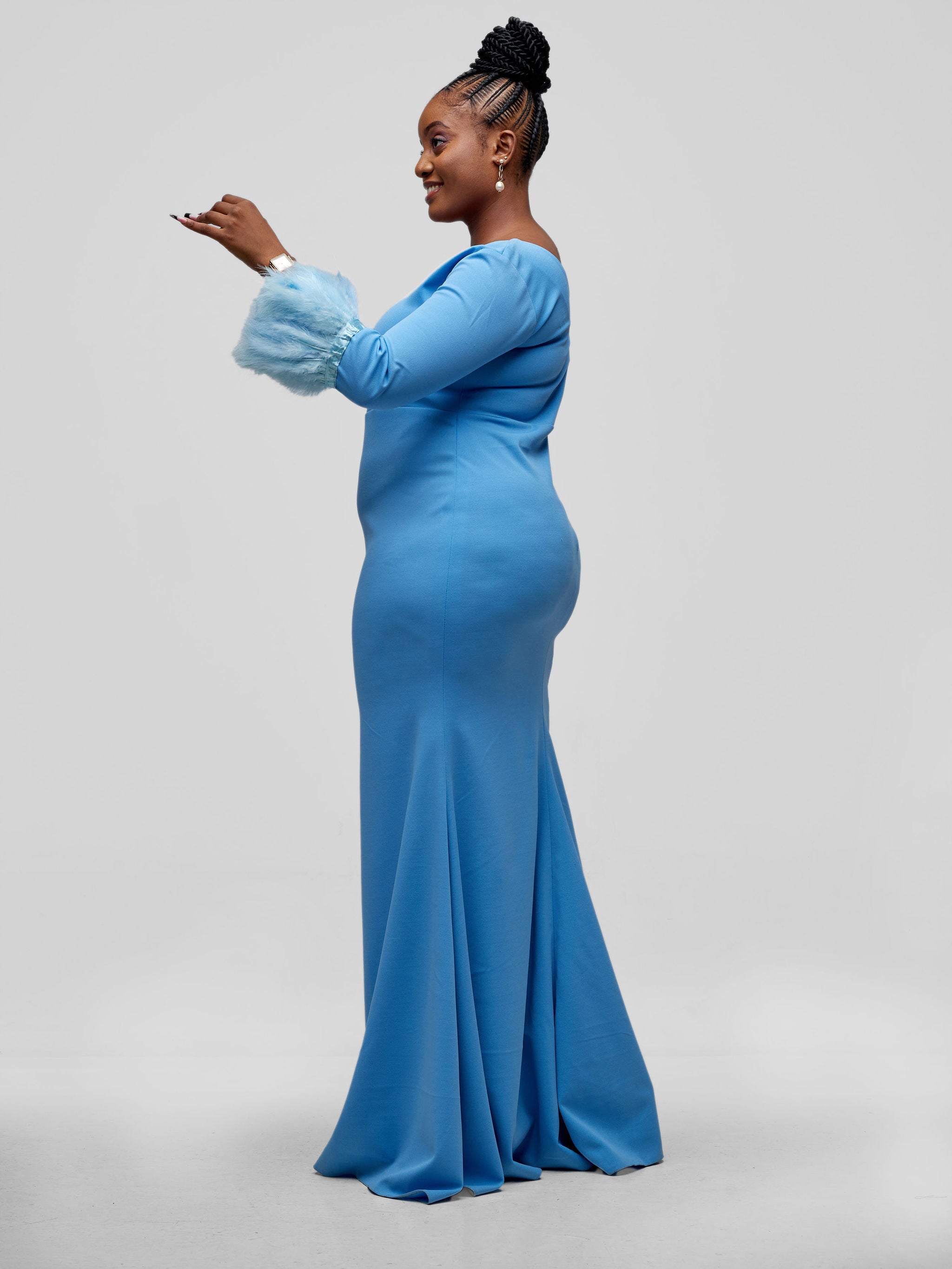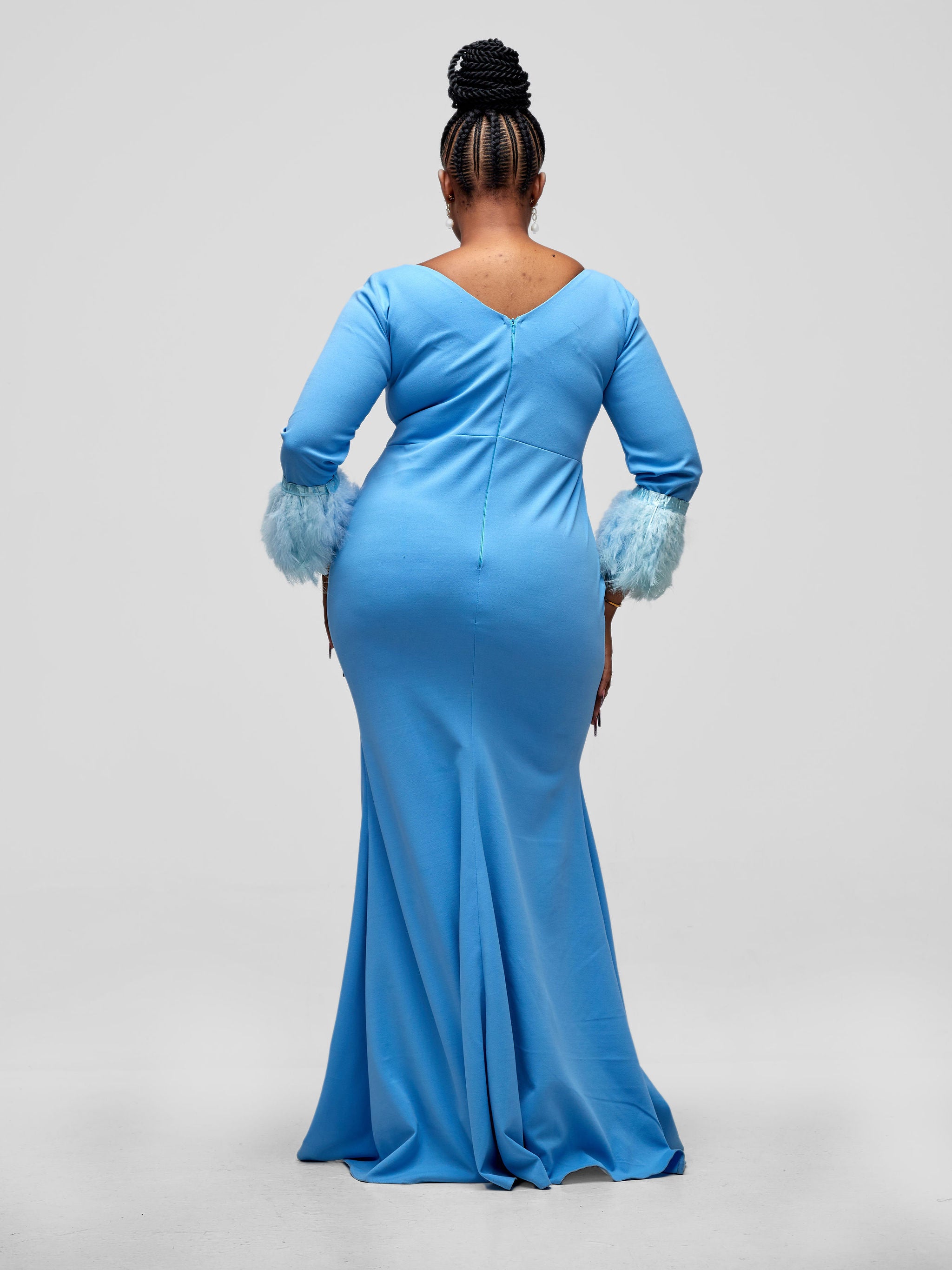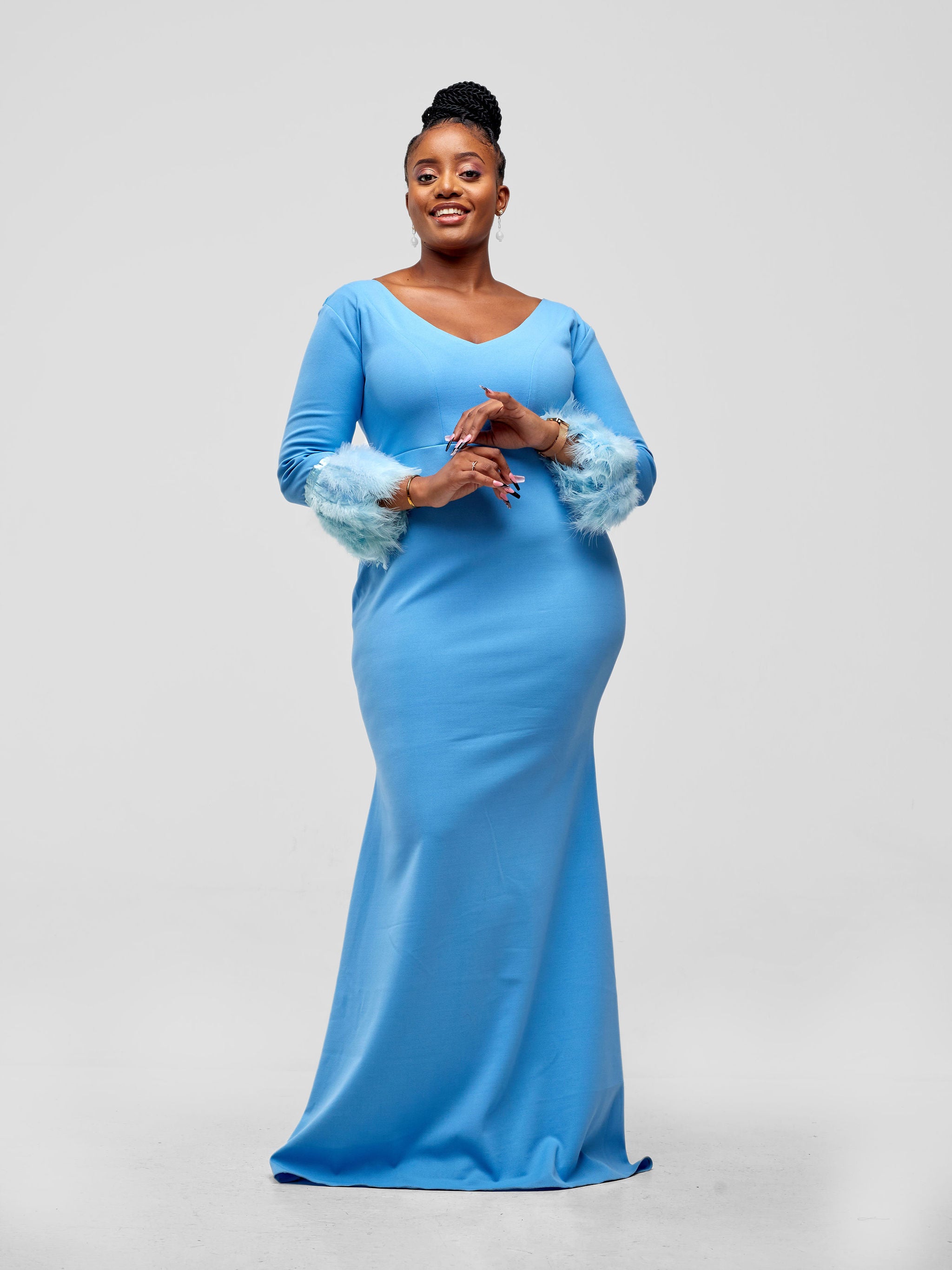 V-Neckline Taraji Dress with a clean finishing, long and fluffy feathery sleeves.