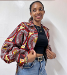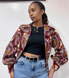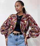 Introducing the KIVULI CROP JACKET BROWN - a stylish, versatile piece that will elevate any outfit. Made with a unique brown print Kitenge fabric, this crop jacket features drawstrings and long puffy sleeves for a comfortable and customizable fit. Perfect for adding a touch of elegance to your wardrobe.