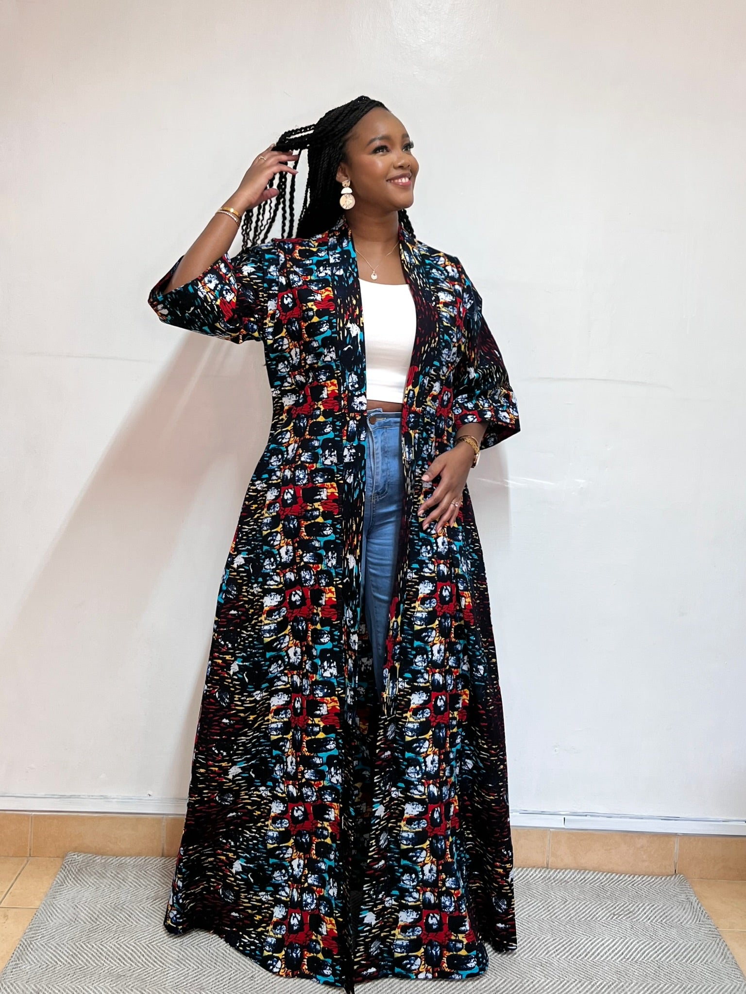 "The Mwanga Kimono is a must-have for any fashion-forward individual. Crafted with vibrant Ankara prints and featuring convenient pockets and mid-length sleeves, this kimono offers comfort and style. Its multicolored design adds a touch of playful personality to any outfit."