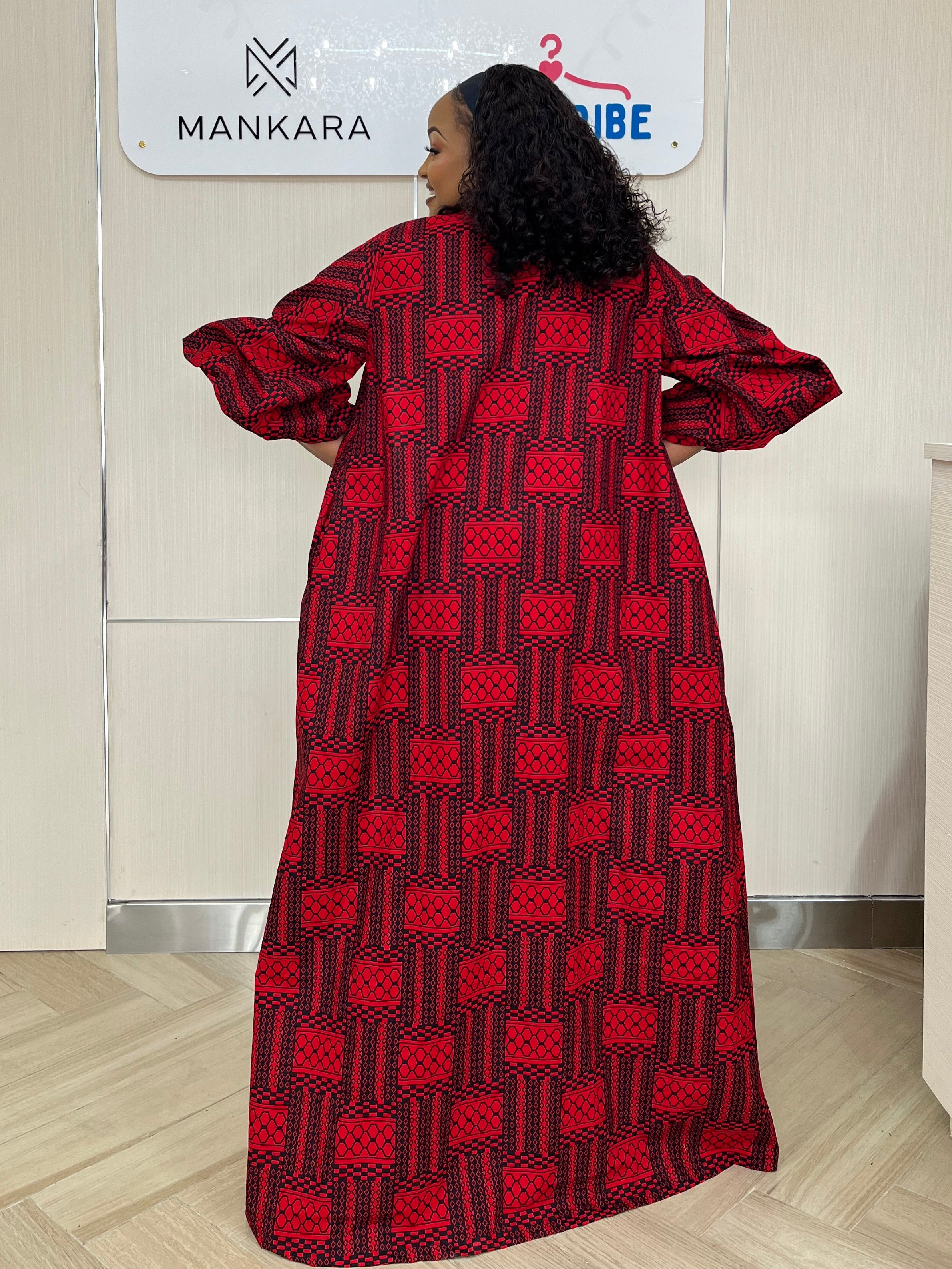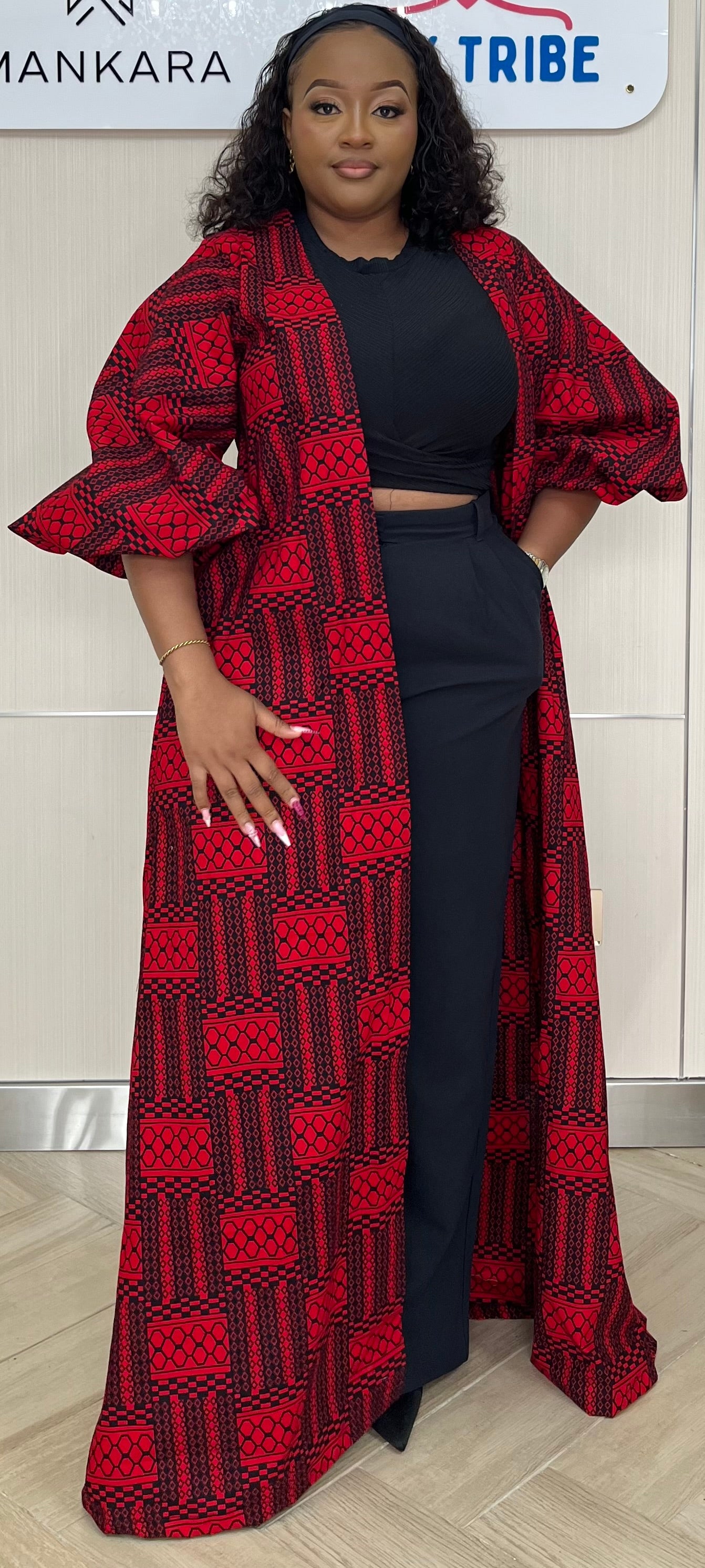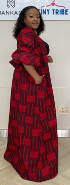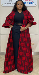 The Ozone Kimono features a striking red Ankara design, complemented by intricately detailed sleeves. This versatile garment pairs effectively with black or white pants, offering a visually appealing option for various occasions. Its bold aesthetic enhances outfit choices, making it suitable for both casual and formal settings.