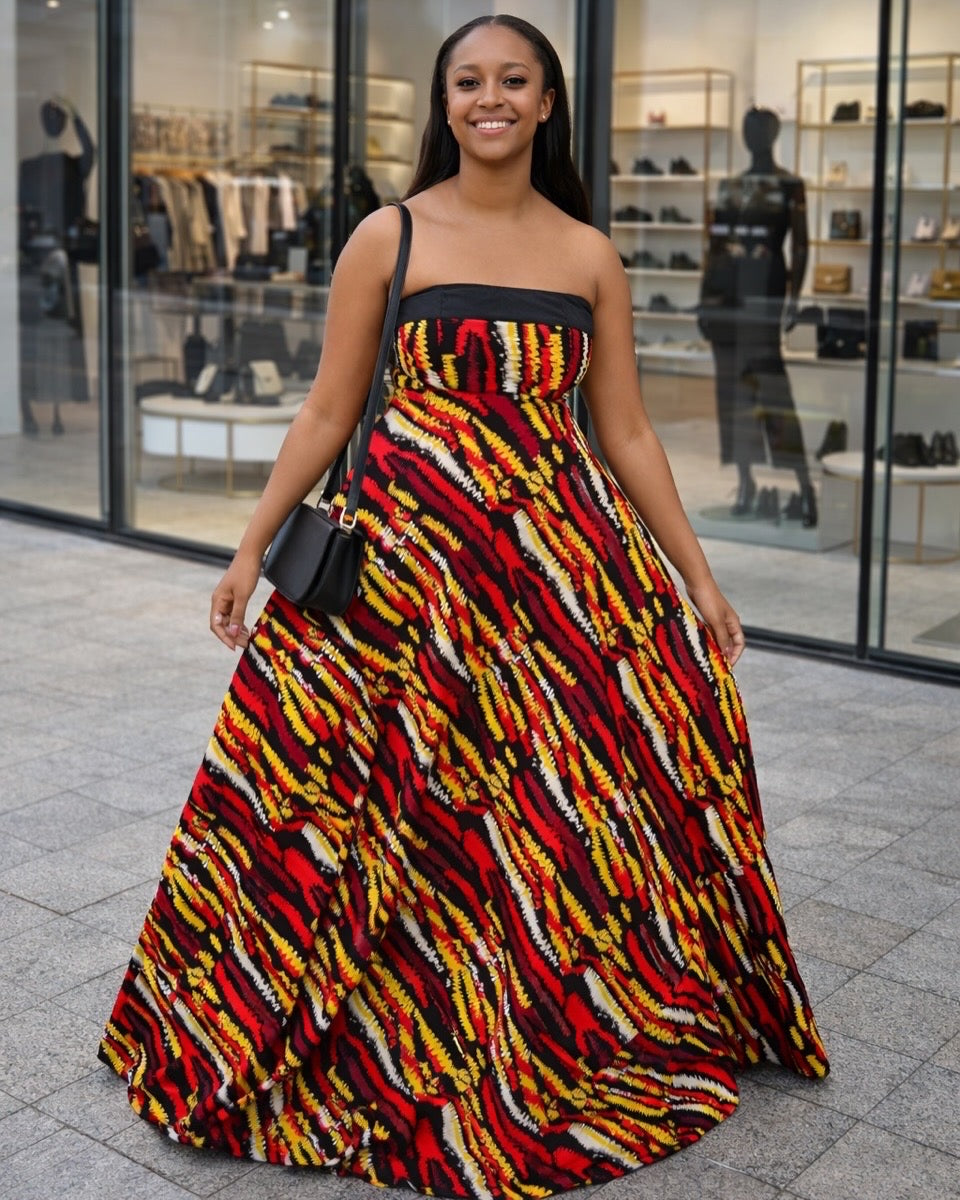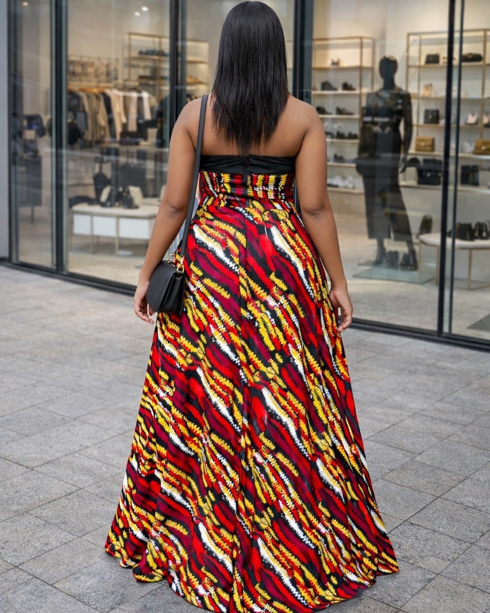 Get ready to make a statement with our "STRAPLESS MAXI ~printed" dress! Featuring a bold, colorful print, this elegant strapless maxi will have you turning heads wherever you go. Perfect for any occasion, you'll feel confident and stylish in this one-of-a-kind dress. (Don't believe us? Try it and see for yourself!)
