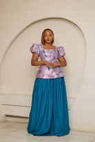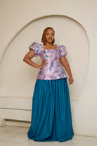 Elevate your style with the Tealani Skirt set. Featuring a stunning turquoise long flowy skirt and a detailed brocade top with corset design and puffy sleeves, this set adds elegance and flair to any occasion. Perfect for those seeking comfort and fashion-forwardness, making it a must-have addition to your wardrobe.