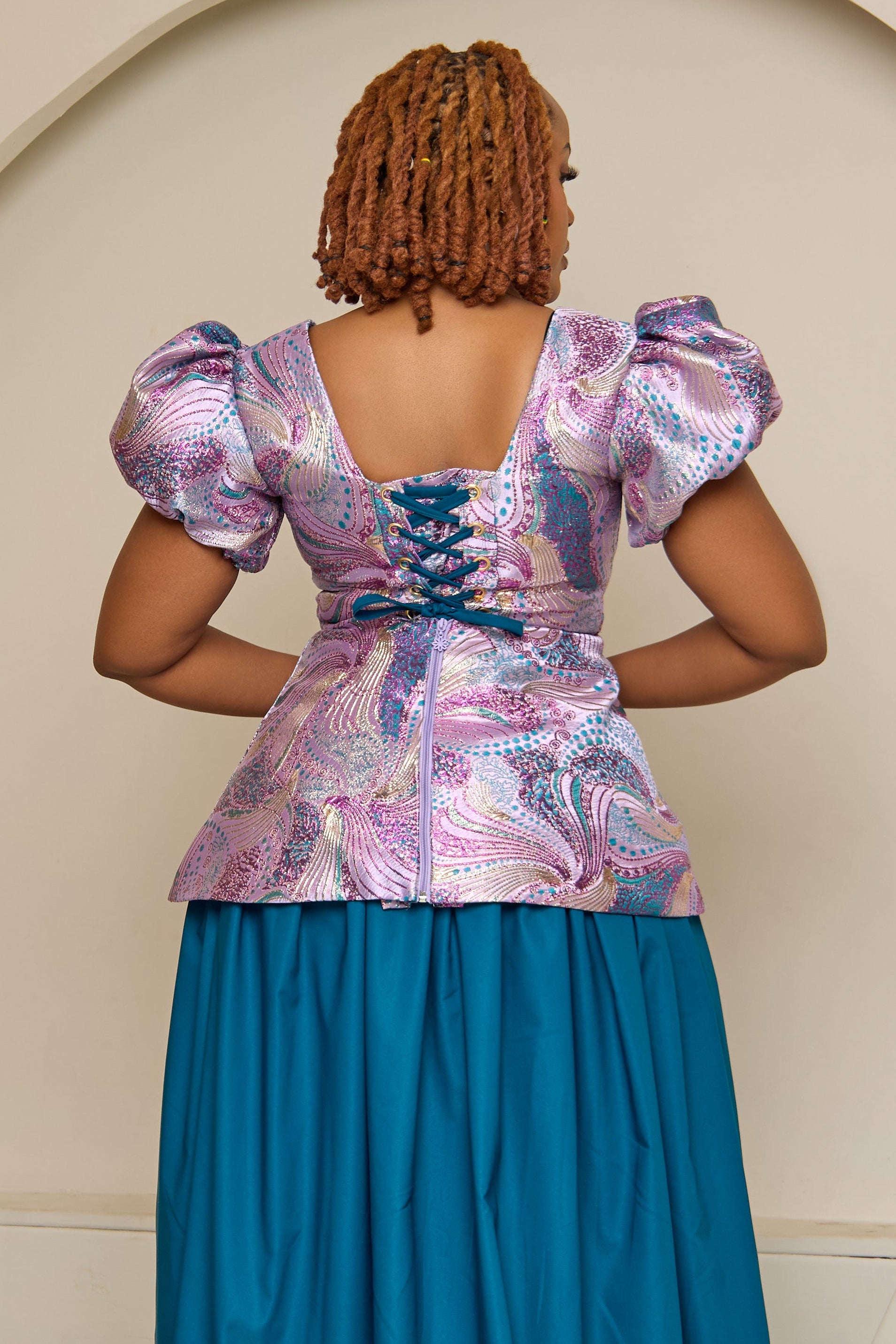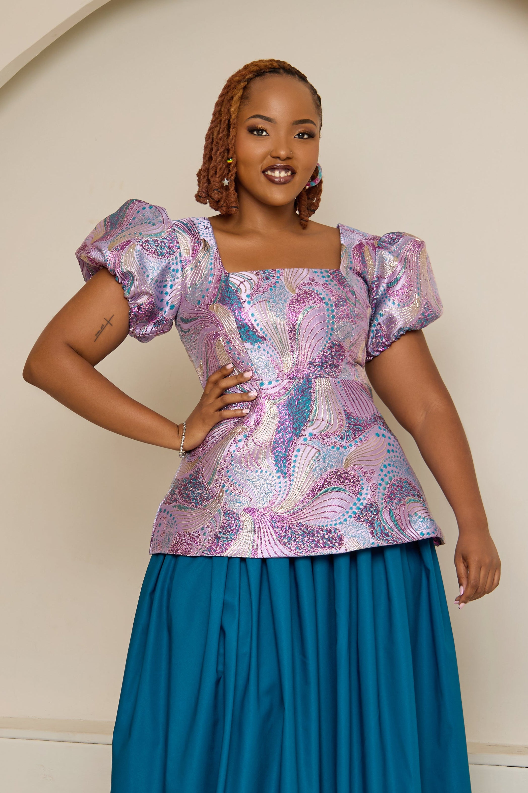Elevate your wardrobe with the Tealani Top! Crafted from luxurious brocade fabric, its elegant sleeve and back detail create a stunning silhouette. Effortlessly style it with plain-colored pants or a skirt to showcase its beauty. Experience the perfect blend of sophistication and versatility!