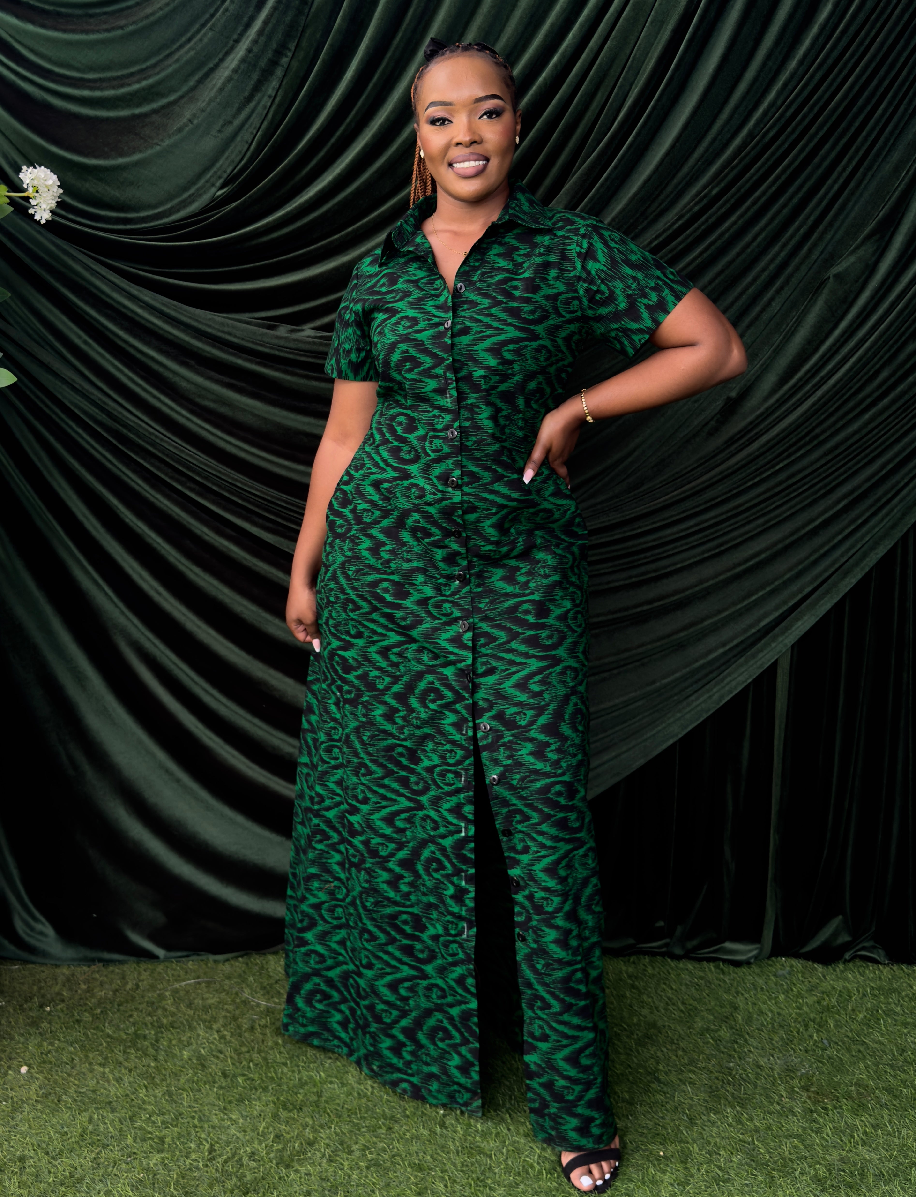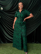 Introducing the LELA MAXI SHIRT DRESS! This stunning green dress features a maxi length, button front, and short sleeves with side slits. Perfect for any occasion, it offers comfort and style in one. Embrace effortless elegance with the LELA MAXI SHIRT DRESS.