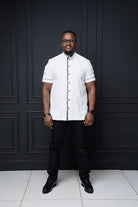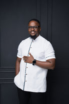 Elevate your style with our Asani Shirt in white! Made with a Chinese collar and delicate Ankara detailing on the button line, this shirt brings a unique touch to any outfit. Stand out from the crowd and make a statement with this versatile and stylish piece.
