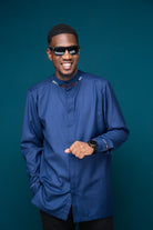 Elevate your wardrobe with the stylish Leo Shirt for men. This blue long-sleeved shirt features a unique touch of Ankara on the neck and sleeves, adding a pop of color and pattern to your look. Perfect for both formal and casual occasions, it's a versatile piece that exudes confidence and style. Upgrade your fashion game with the Leo Shirt.