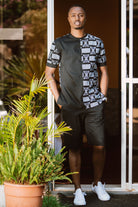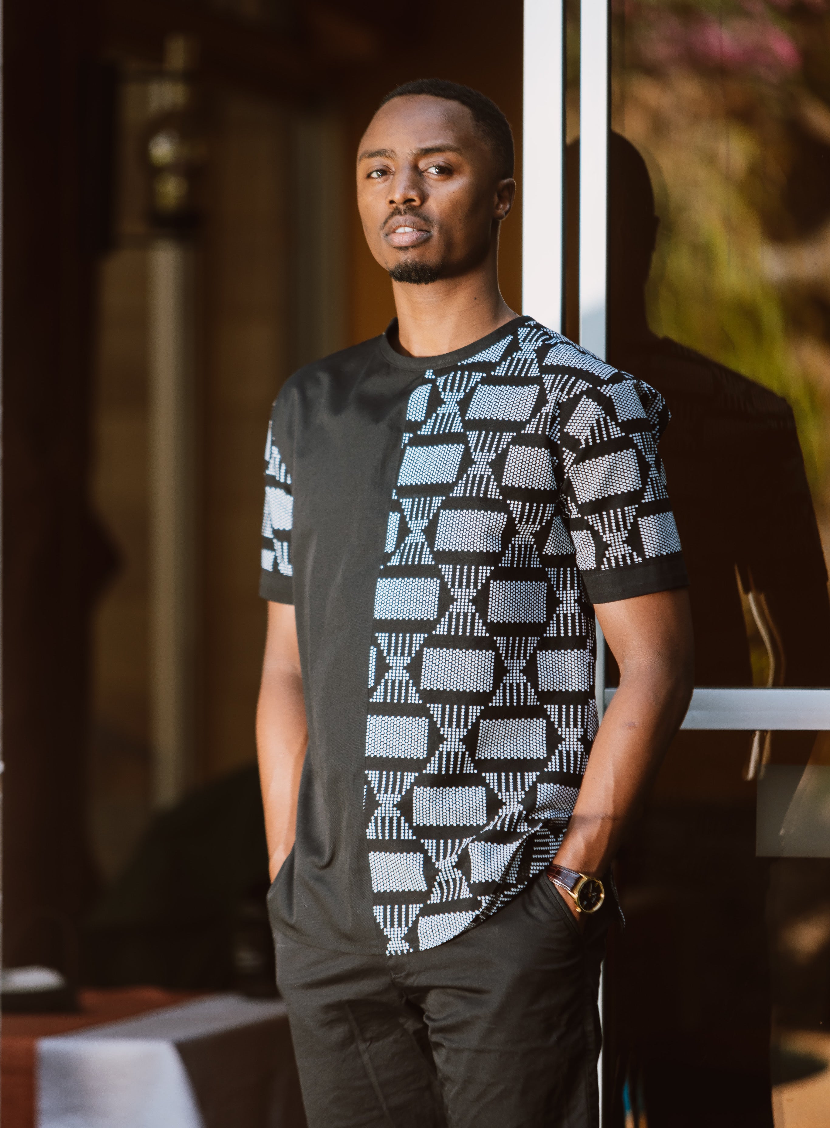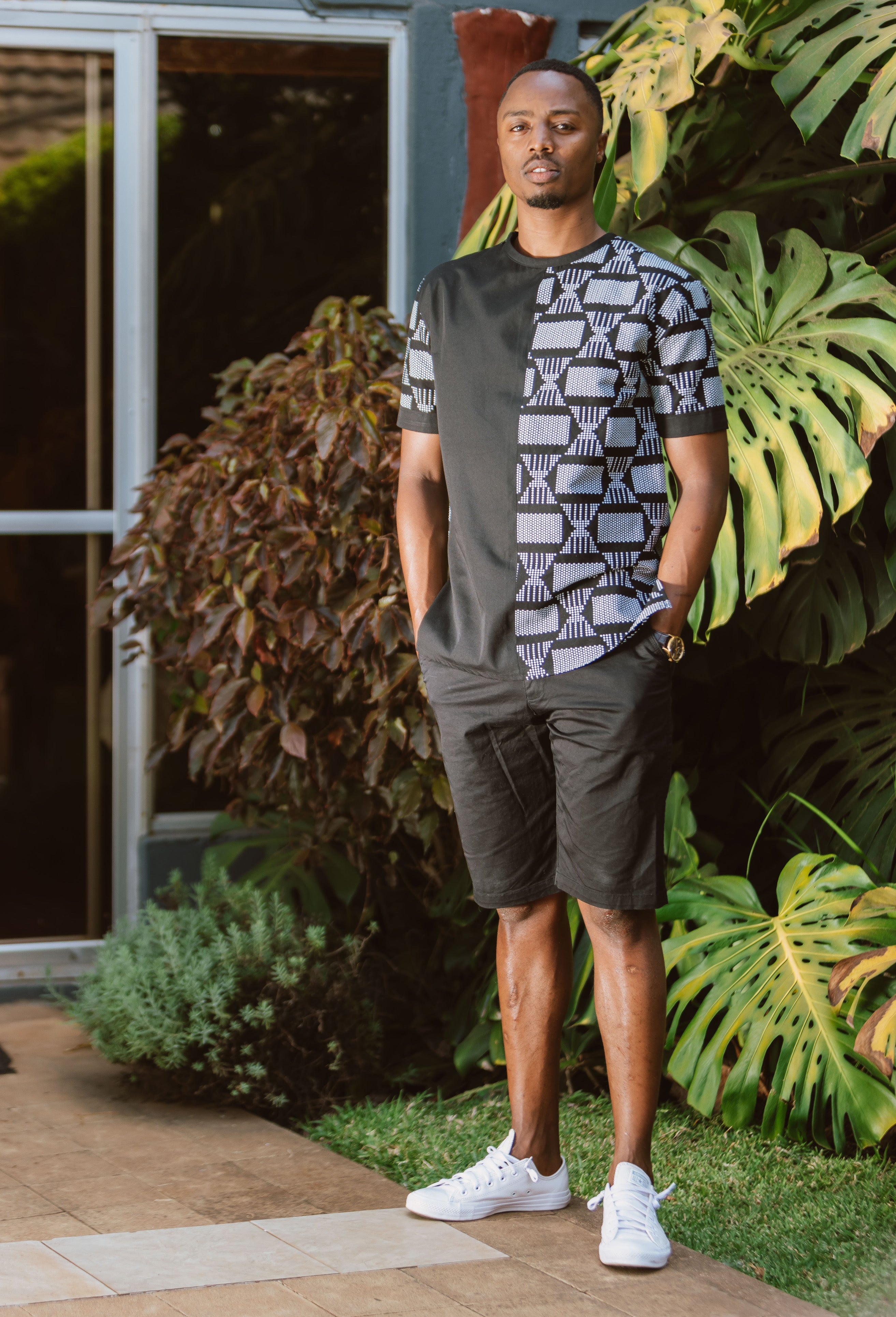 The amana shirt is a shorter version of the Gameli shirt. The shirt has equal half panels of black and white at the front.