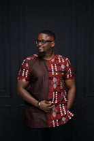 Introducing our Balozi Shirt in brown, designed for the modern man. Crafted with a rich Ankara fabric, this stylish shirt is perfect for any occasion. Its unique, half-patched design adds a touch of sophistication and charm to your look. Upgrade your wardrobe with this eventful and smart piece.