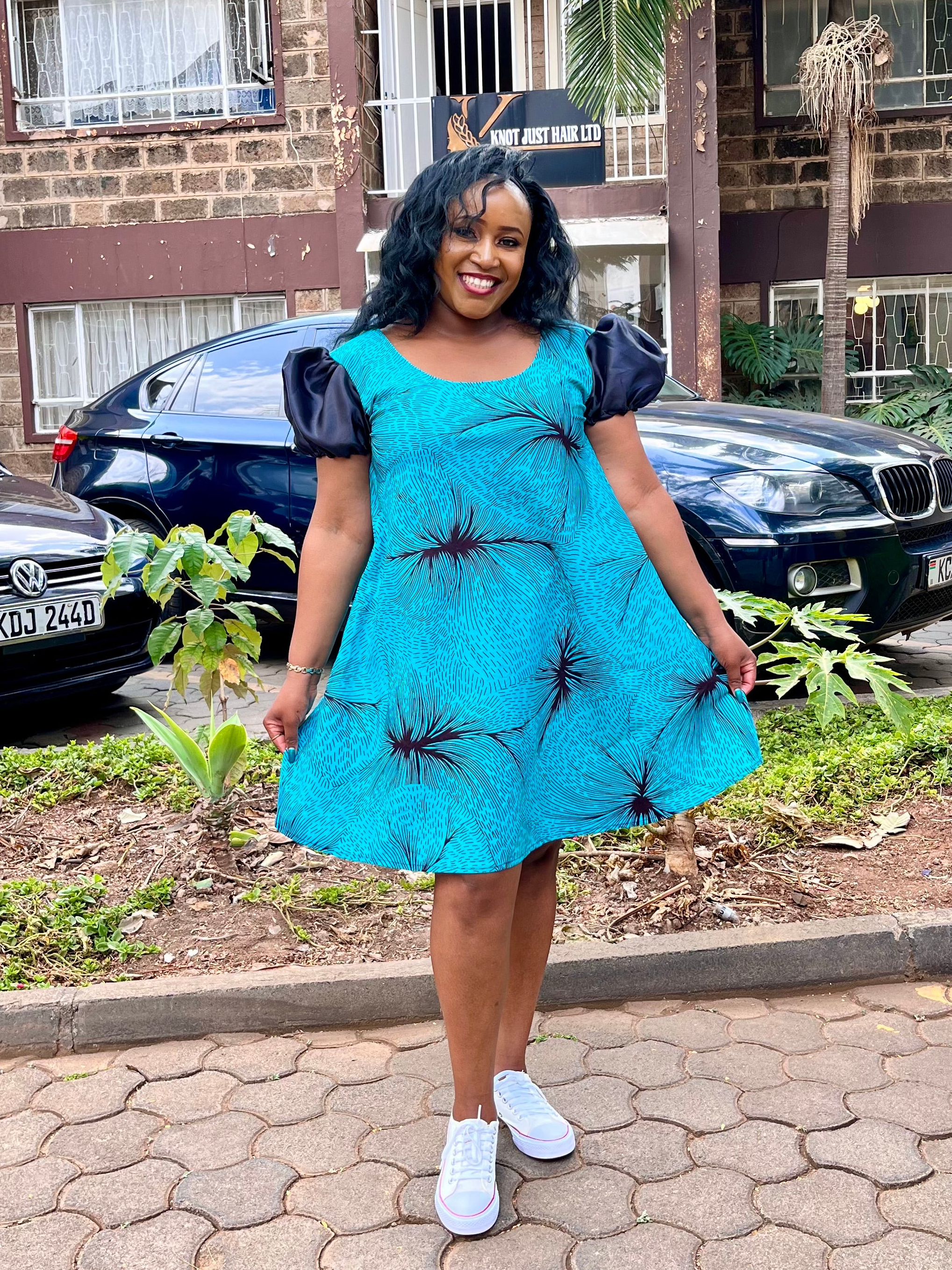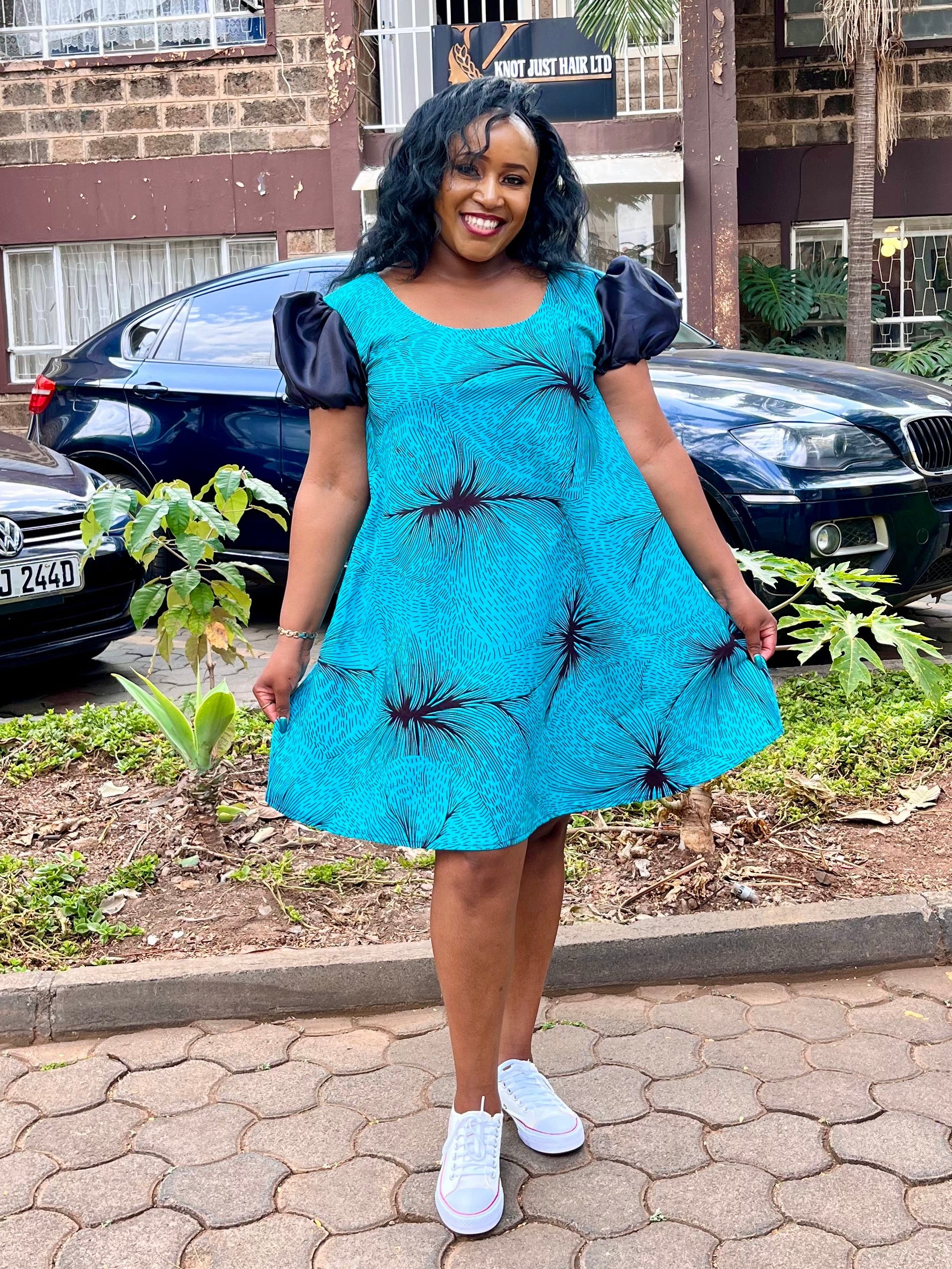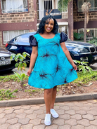 Transform your wardrobe with our ASHA DRESS TURQUOISE! This A-line round dress boasts vibrant turquoise and playful puffy black sleeves. Perfect for casual weekends and events, it's the ultimate statement piece. Elevate your style and confidence with ASHA DRESS TURQUOISE!